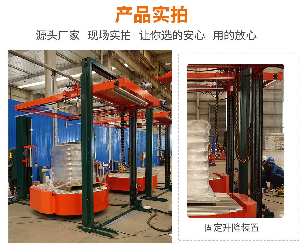 覆頂裝置自動啟動,通過升降機將膜降到貨物頂部,將塑料薄膜卷放在升降架的排膜輥上,排膜輥通過電機和鏈輪鏈條帶動旋轉,