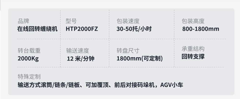 大宏佳森在線(xiàn)回轉(zhuǎn)纏繞機(jī)HTP2000FZ,主要適用于生產(chǎn)量大、物流效率較高的現(xiàn)代化作業(yè),滿(mǎn)足較輕或較重貨物的包裝要求。