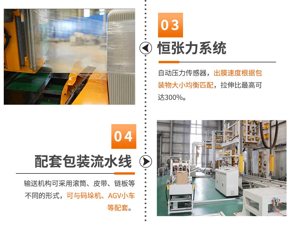 可根據(jù)不同的產(chǎn)品和現(xiàn)場(chǎng)的實(shí)際需求,定制不同的包裝系統(tǒng),自動(dòng)完成貨物的感測(cè)、包裝、輸送等全過(guò)程,
