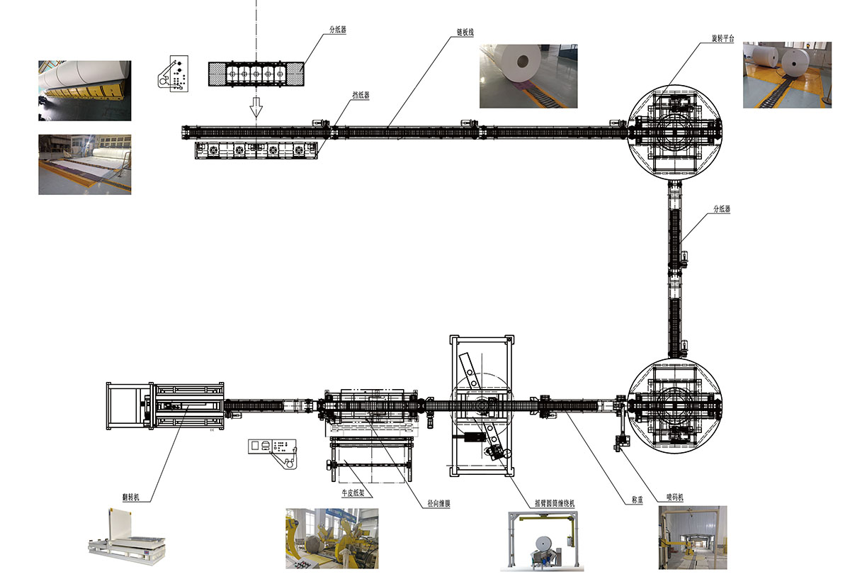 工藝流程:復(fù)卷機(jī)臺(tái)下來(lái)的紙卷-止動(dòng)分配器-氣動(dòng)擋紙器-鏈板輸送機(jī)-電動(dòng)轉(zhuǎn)盤-稱重裝置-自動(dòng)噴碼機(jī)-自動(dòng)貼標(biāo)機(jī)-自動(dòng)捆扎機(jī)(纏膜)-豎身升降機(jī)